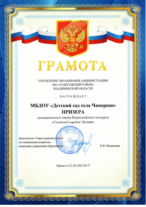 Грамота МБДОУ "Детский сад села Чамерево" ПРИЗЕРА муниципального этапа Всероссийского конкурса "Снежный городок Эколят"