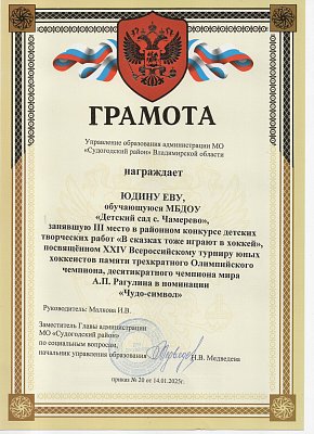 Наша воспитанница Юдина Ева группа "Цыплята" заняла 3 место в районном конкурсе в номинации "Чудо-символ". Руководитель Малкова Ирина Васильевна