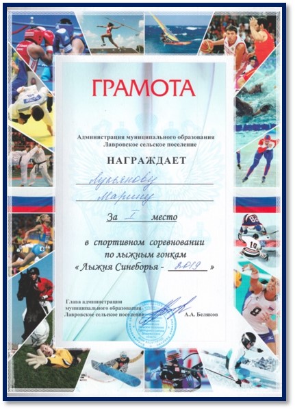 Грамота за участие в спортивных соревнованиях «Лыжня Синеборья»