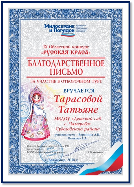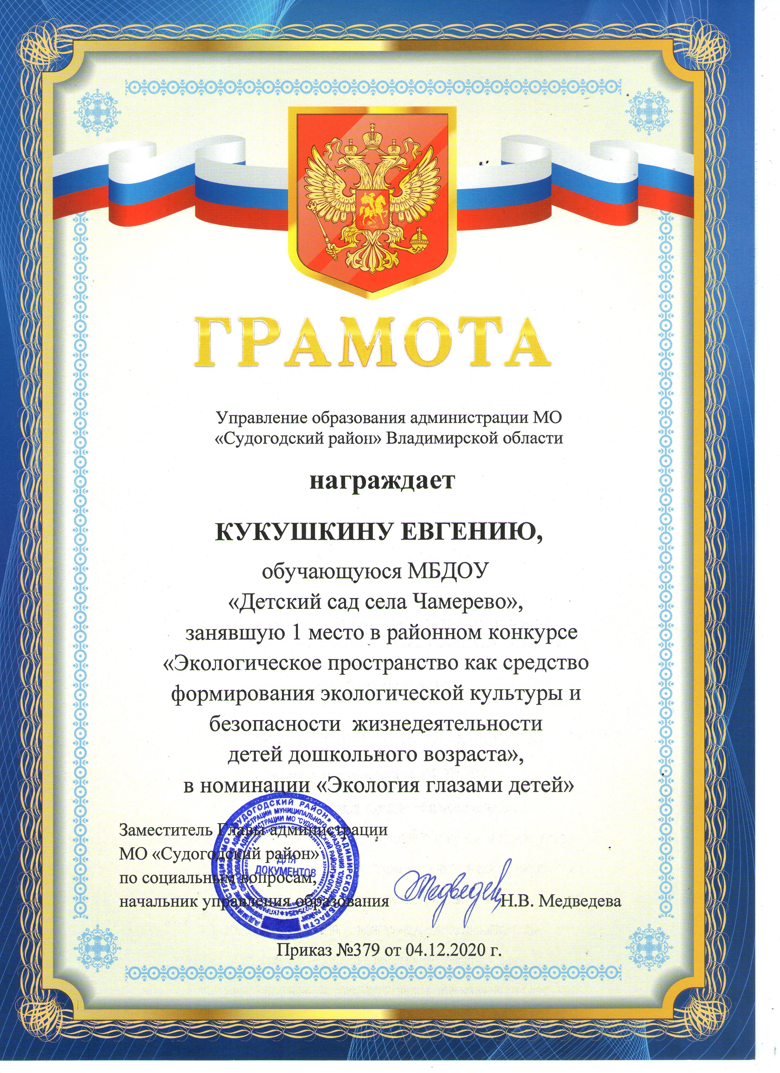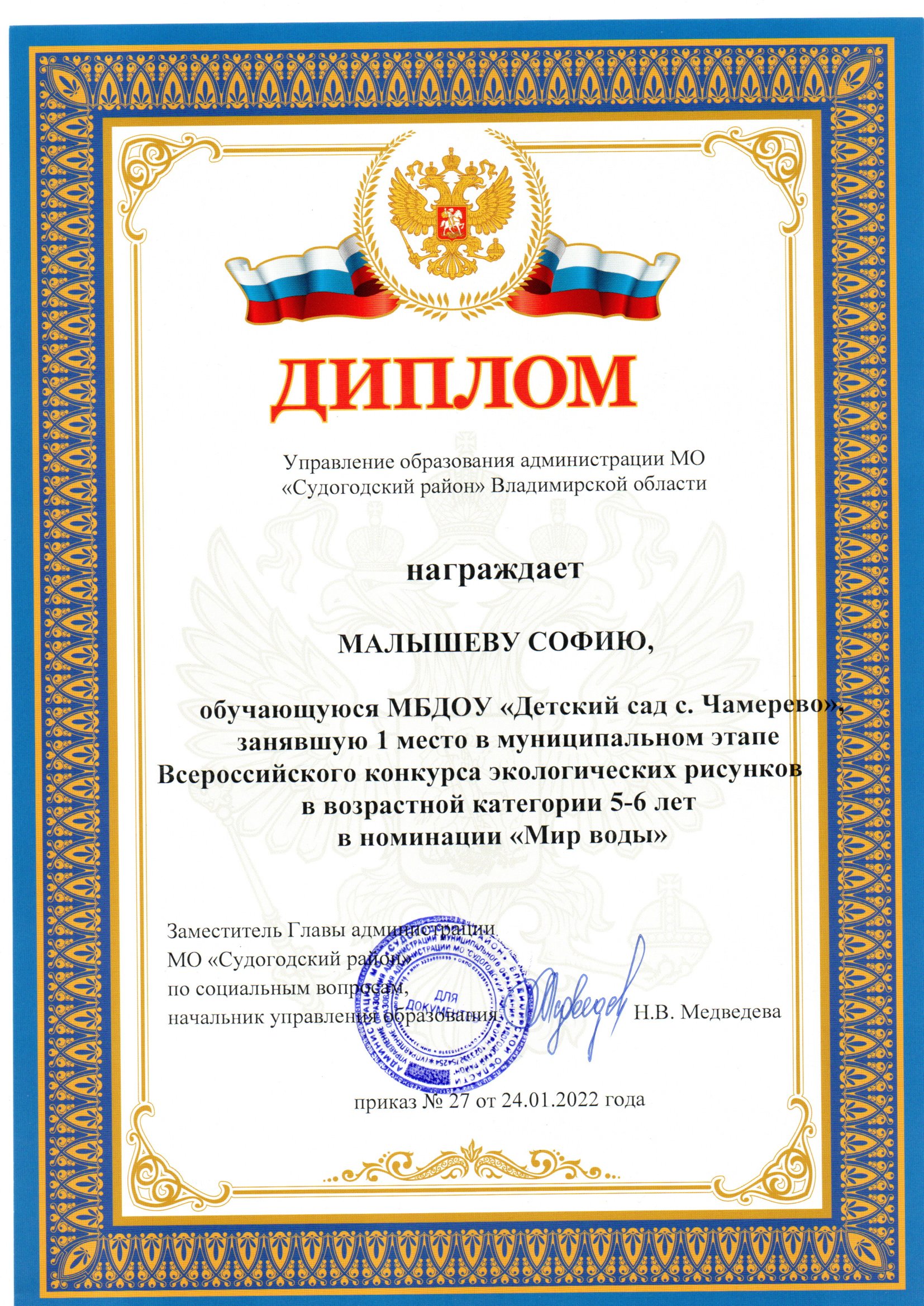 Диплом за 1-е место обучающемуся в МБДОУ "Детский сад с. Чамерево" Малышевой Софии в муниципальном этапе Всероссийского конкурса экологических рисунков в возрастной категории 5-6 лет в номинации "Мир воды". 2022г.