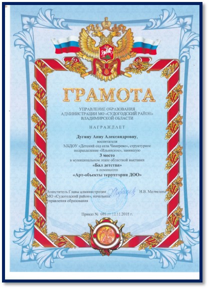 Грамота за участие в муниципальном конкурсе «Бал детства» номинация «Арт-объекты территории ДОО»