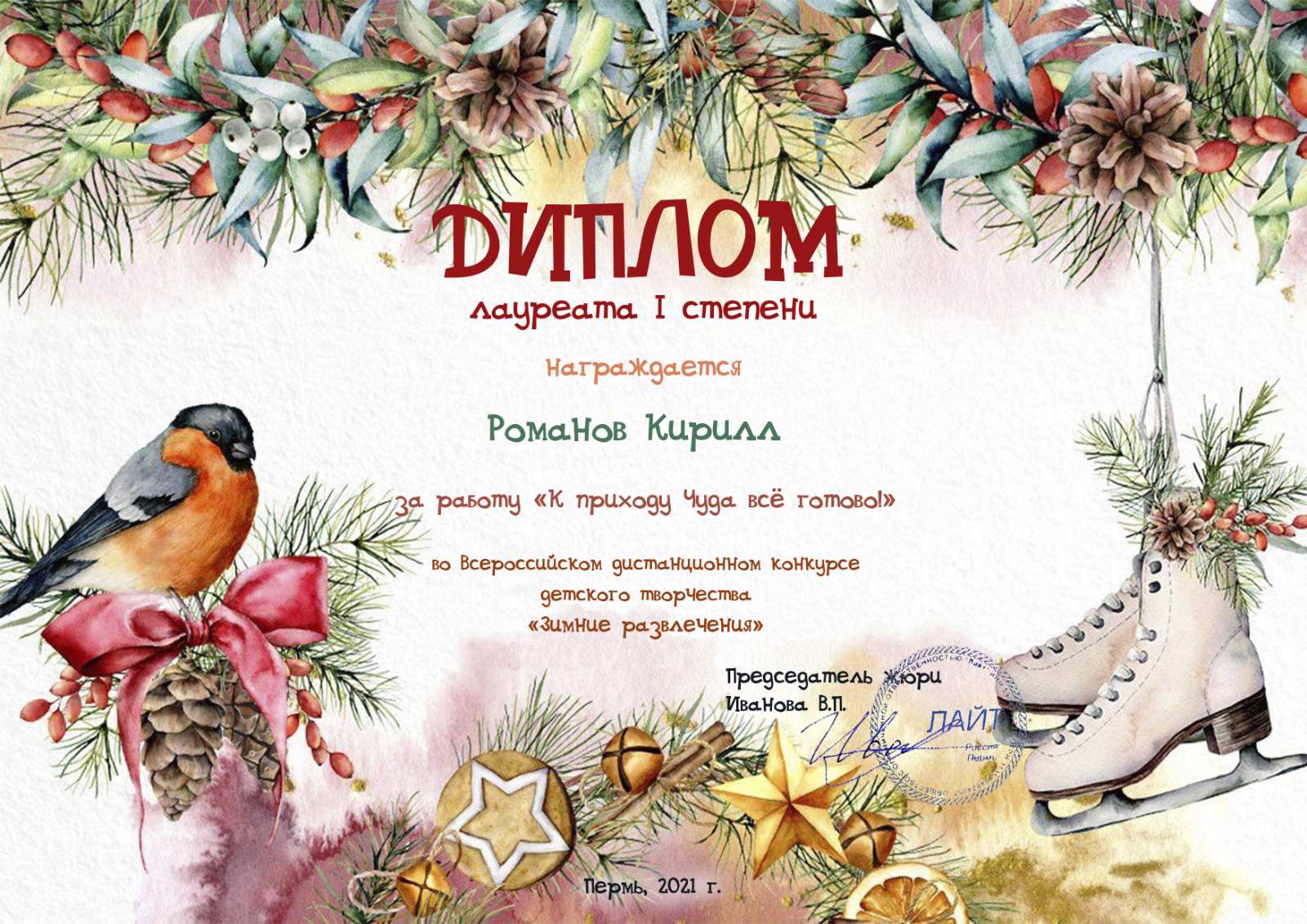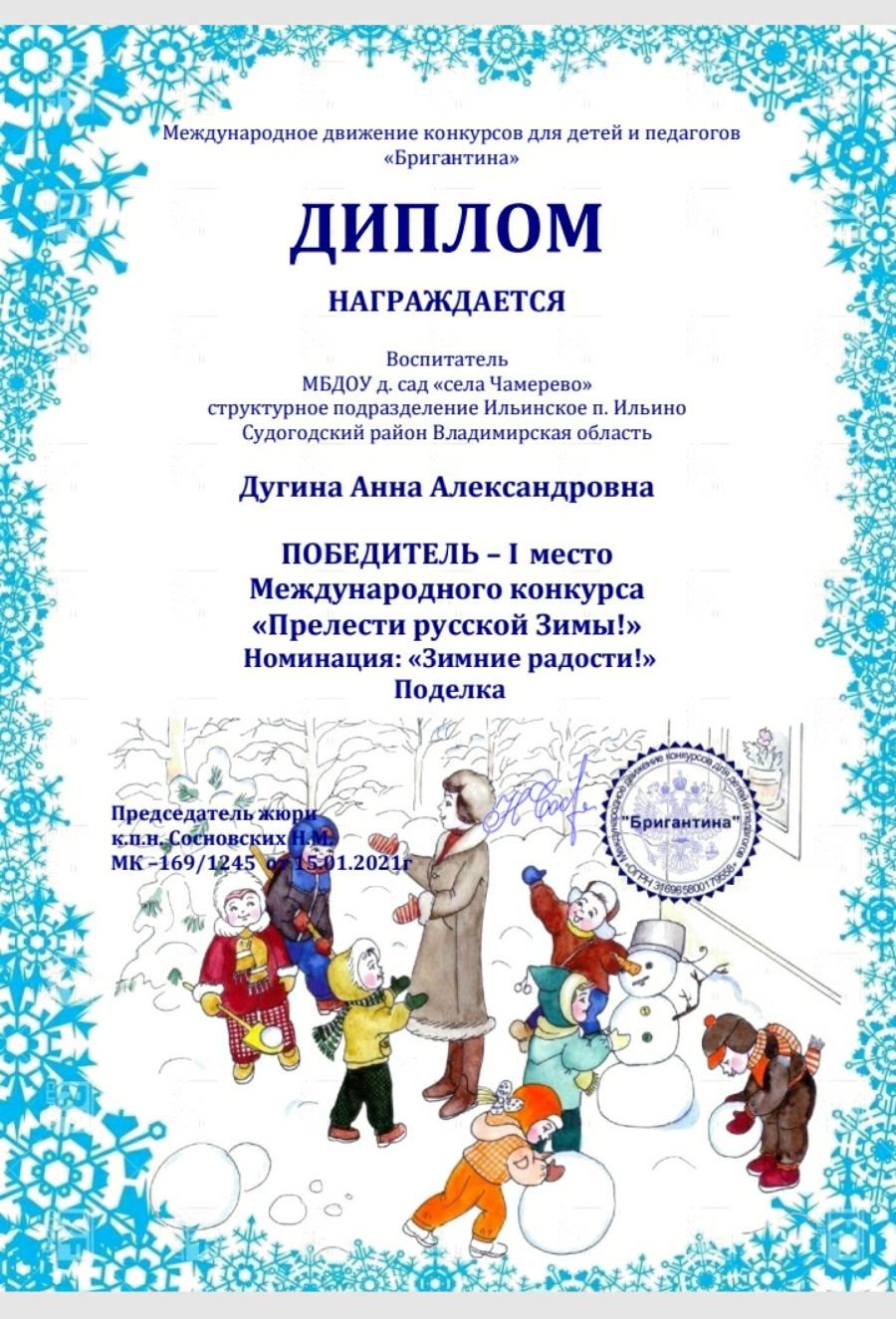 Диплом за 1 место в международном конкурсе "Прелести русской зимы" номинация "Зимние радости"