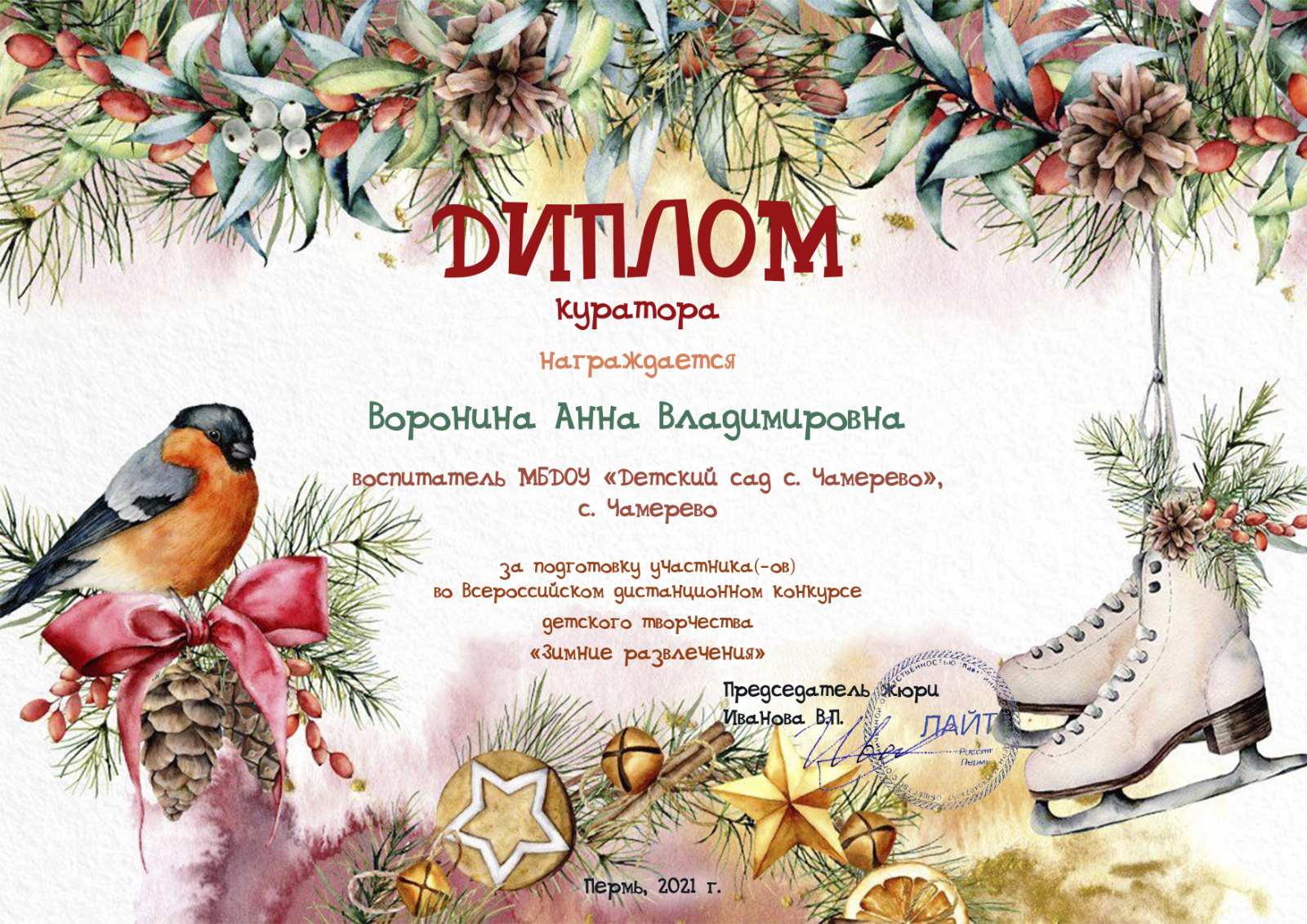 Диплом лауреата 1 степени во Всероссийском дистанционном конкурсе детского творчества "Зимние развлечения-2020" и диплом куратора за подготовку участника