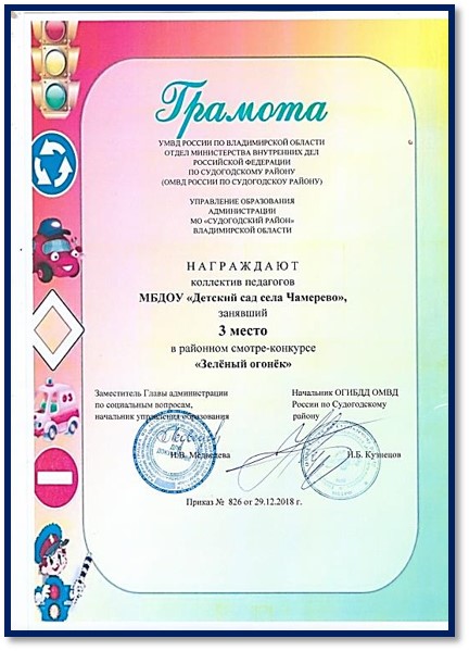 Грамота 1-е место в муниципальном смотре-конкурсе "Зеленый огонек". 2022год.