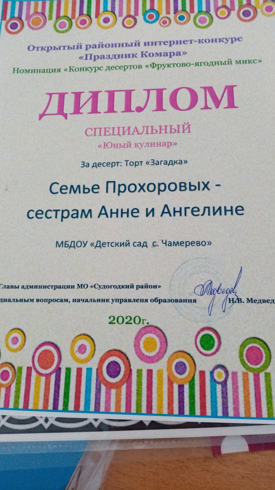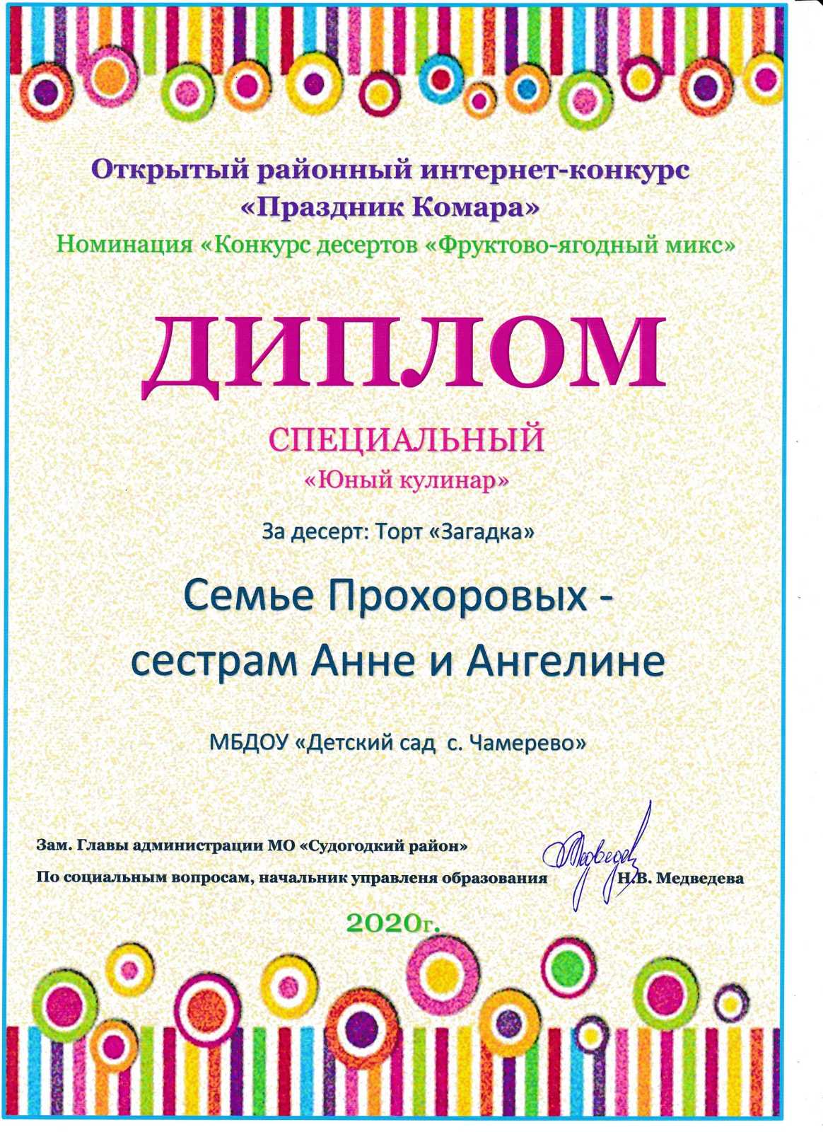 Диплом за участие в открытом районном интернет-конкурсе "Юный кулинар-2020"
