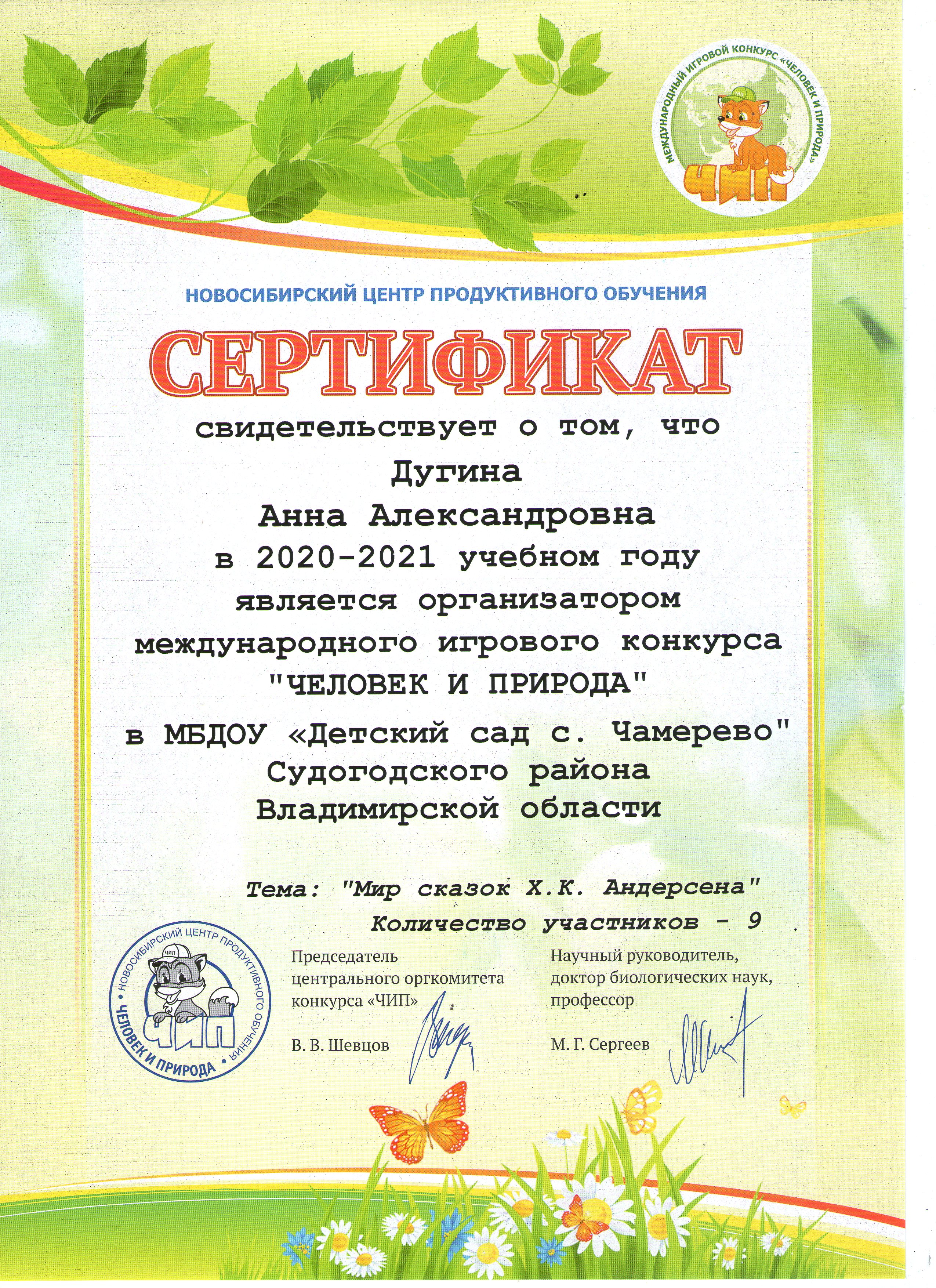 Сертификаты за 1 и 2 места в международном игровом конкурсе "Человек и природа 2020" и сертификат организатору конкурса Дугиной А.А.