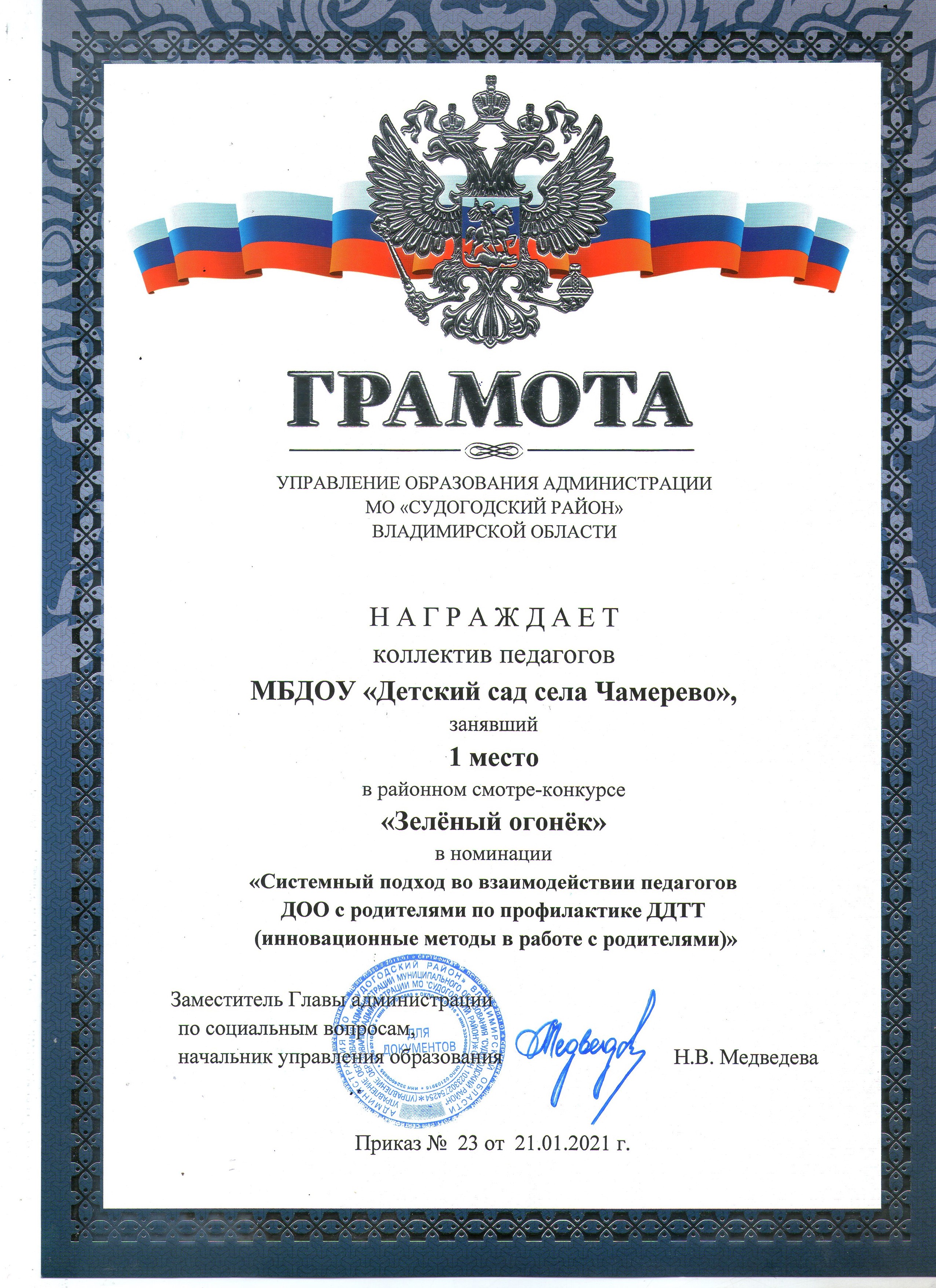 Грамота за участие и 1-е место в районном смотре-конкурсе ''Зеленый огонек'' 2021г.
