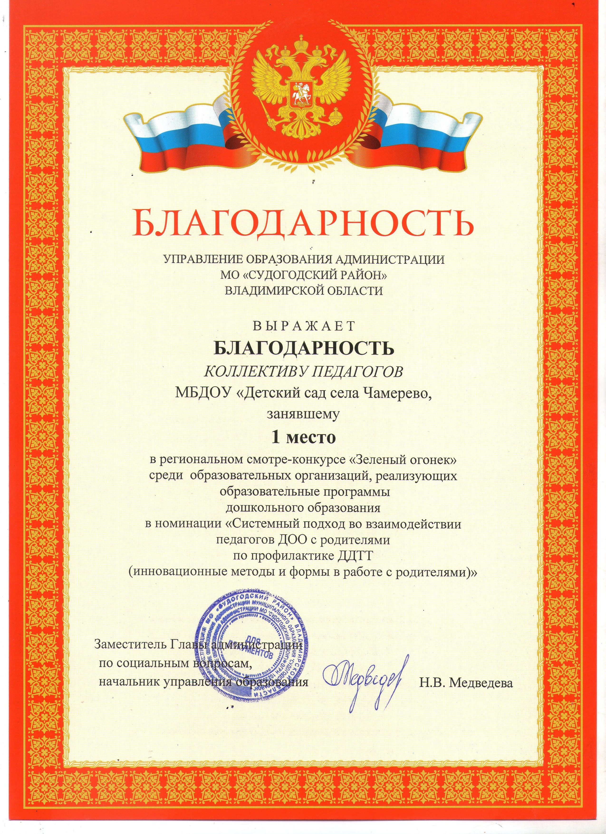 Благодарность за 1-е место в региональном смотре-конкурсе "Зеленый огонек." 2021г.