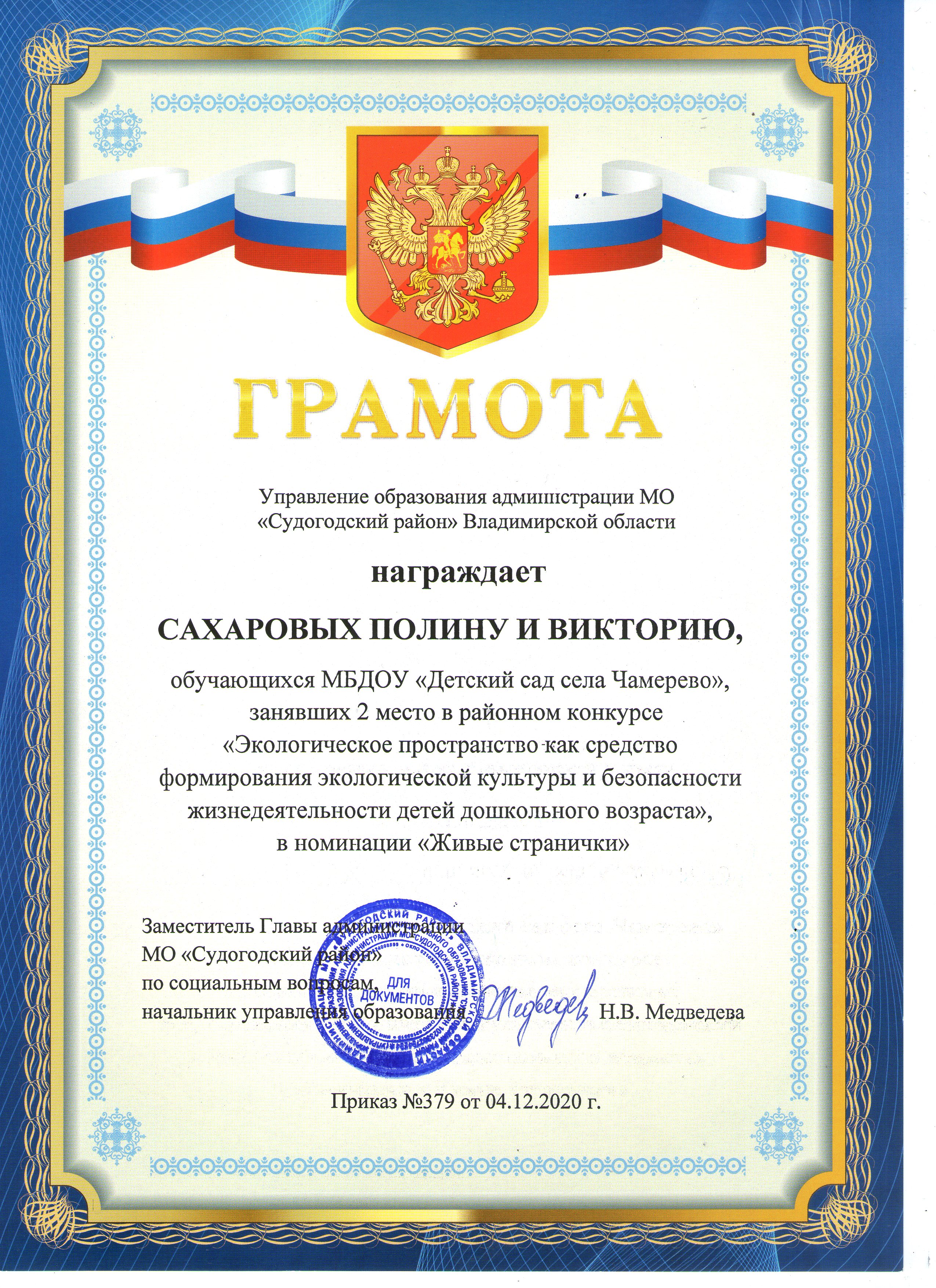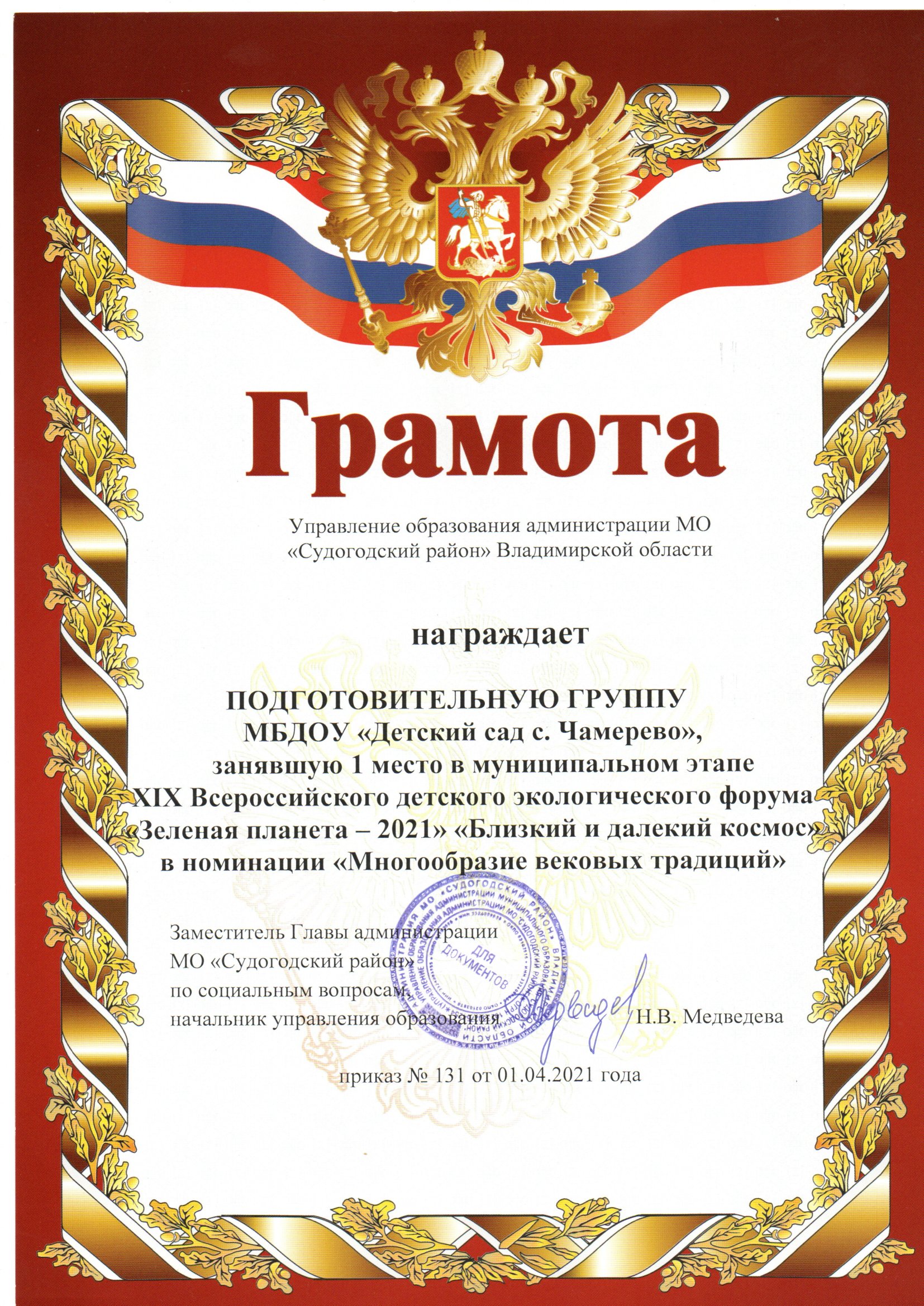 Грамота подготовительной группе МБДОУ "Детский сад с. Чамерево" за 1-е место в муниципальном этапе XIX Всероссийского детского экологического форума "Зеленая планета-2021".
