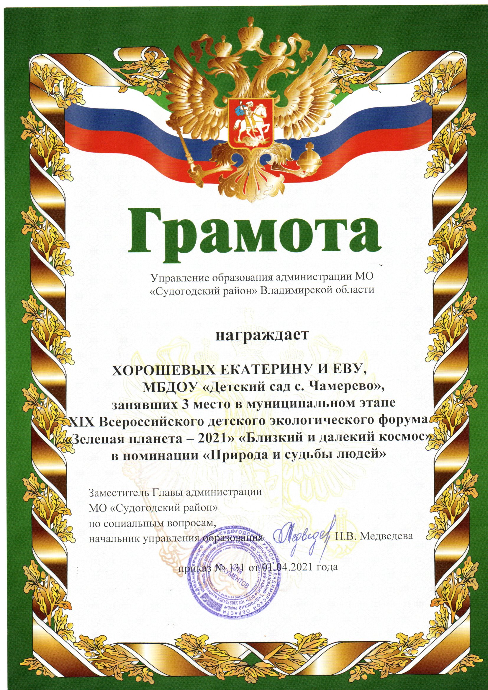 Грамота семье Хорошевых и МБДОУ "Детский сад с. Чамерево" за 3-е место в муниципальном этапе XIX Всероссийского детского экологического форума "Зеленая планета-2021".