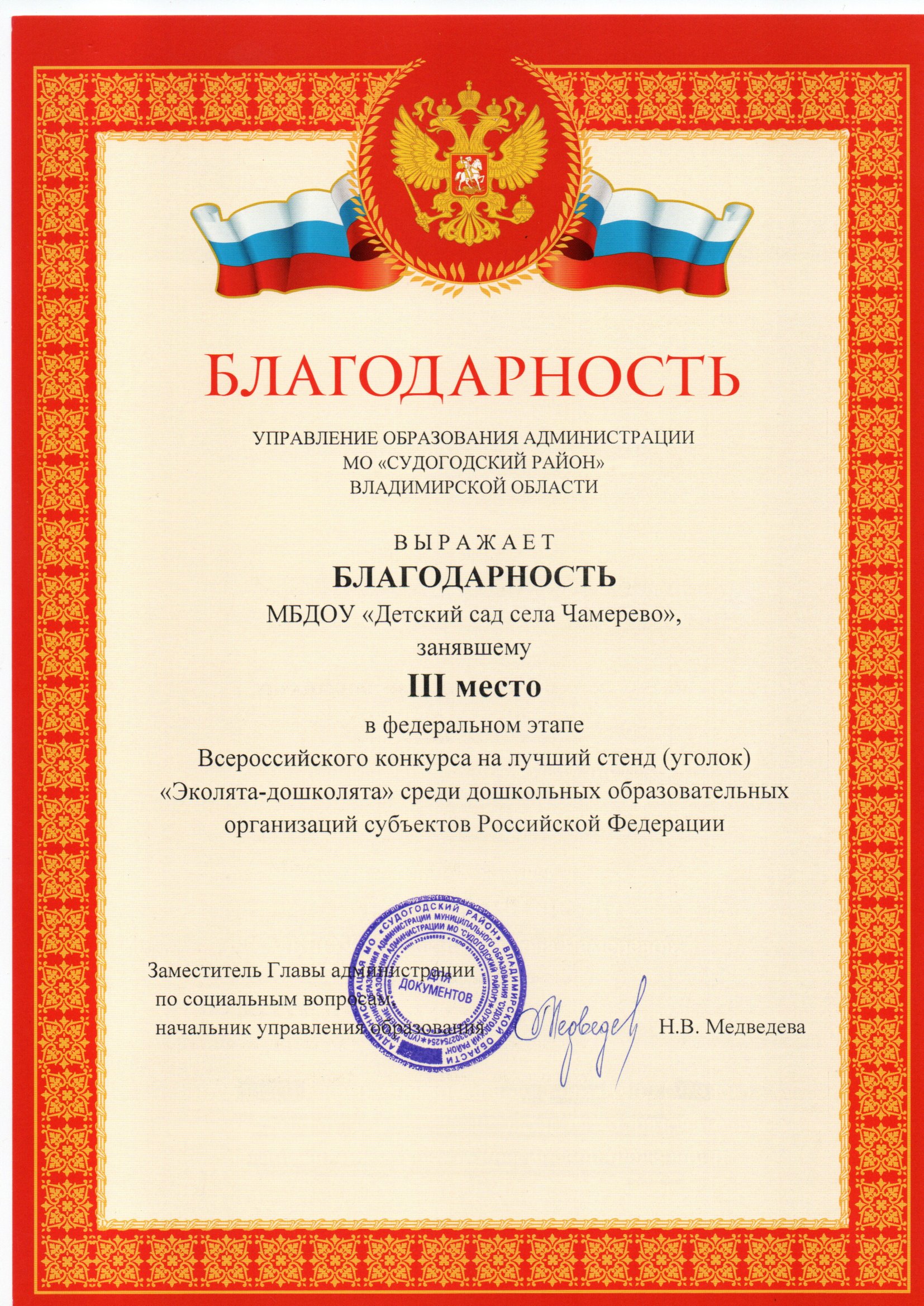 Благодарность МБДОУ "Детский сад с. Чамерево" за 3-е место в федеральном этапе Всероссийского конкурса на лучший стенд (уголок) "Эколята-дошколята" среди дошкольных образовательных организаций субъектов РФ. 2021г.