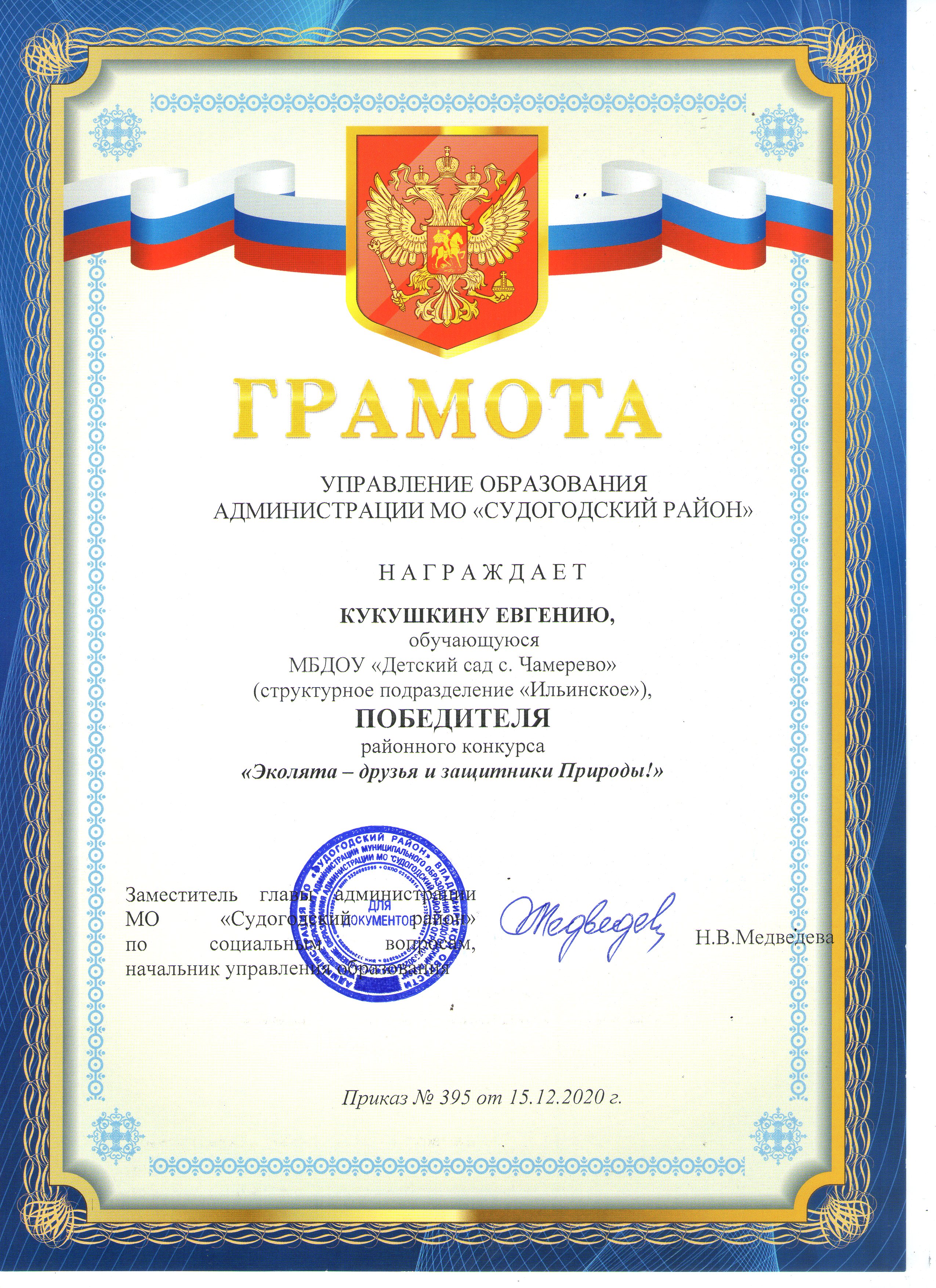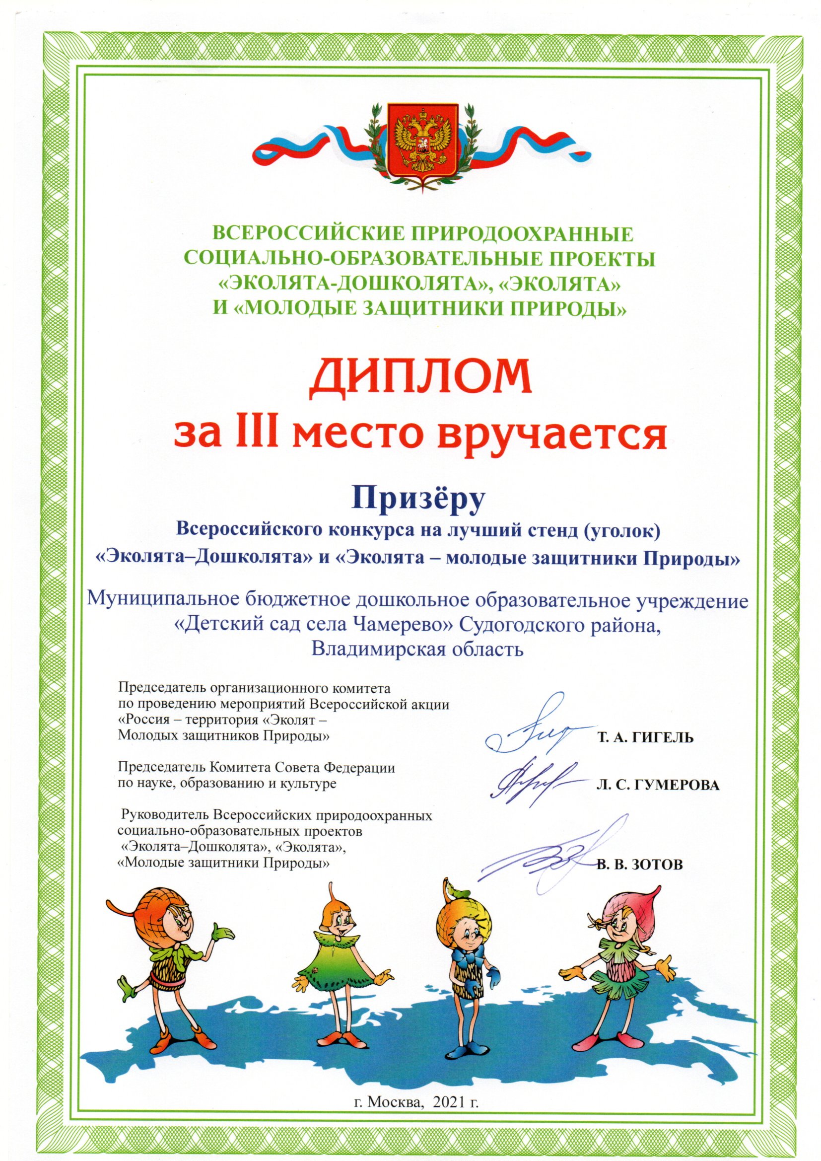 Диплом за 3-е место Призёру Всероссийского конкурса на лучший стенд (уголок) "Эколята-дошколята" и "Эколята-молодые защитники Природы" МБДОУ "Детский сад с. Чамерево" Судогодского района, Владимирская область. (г. Москва 2021г.)