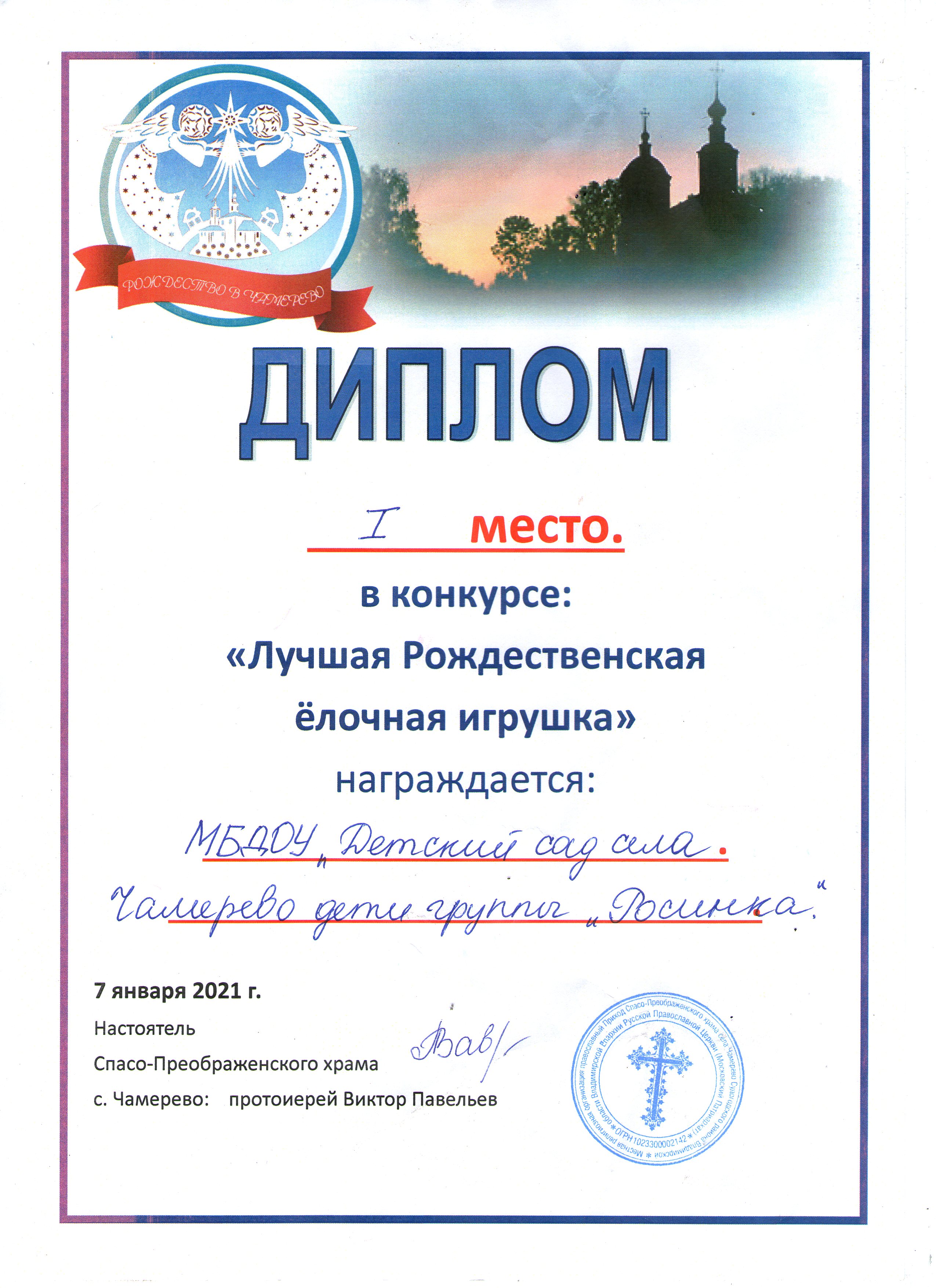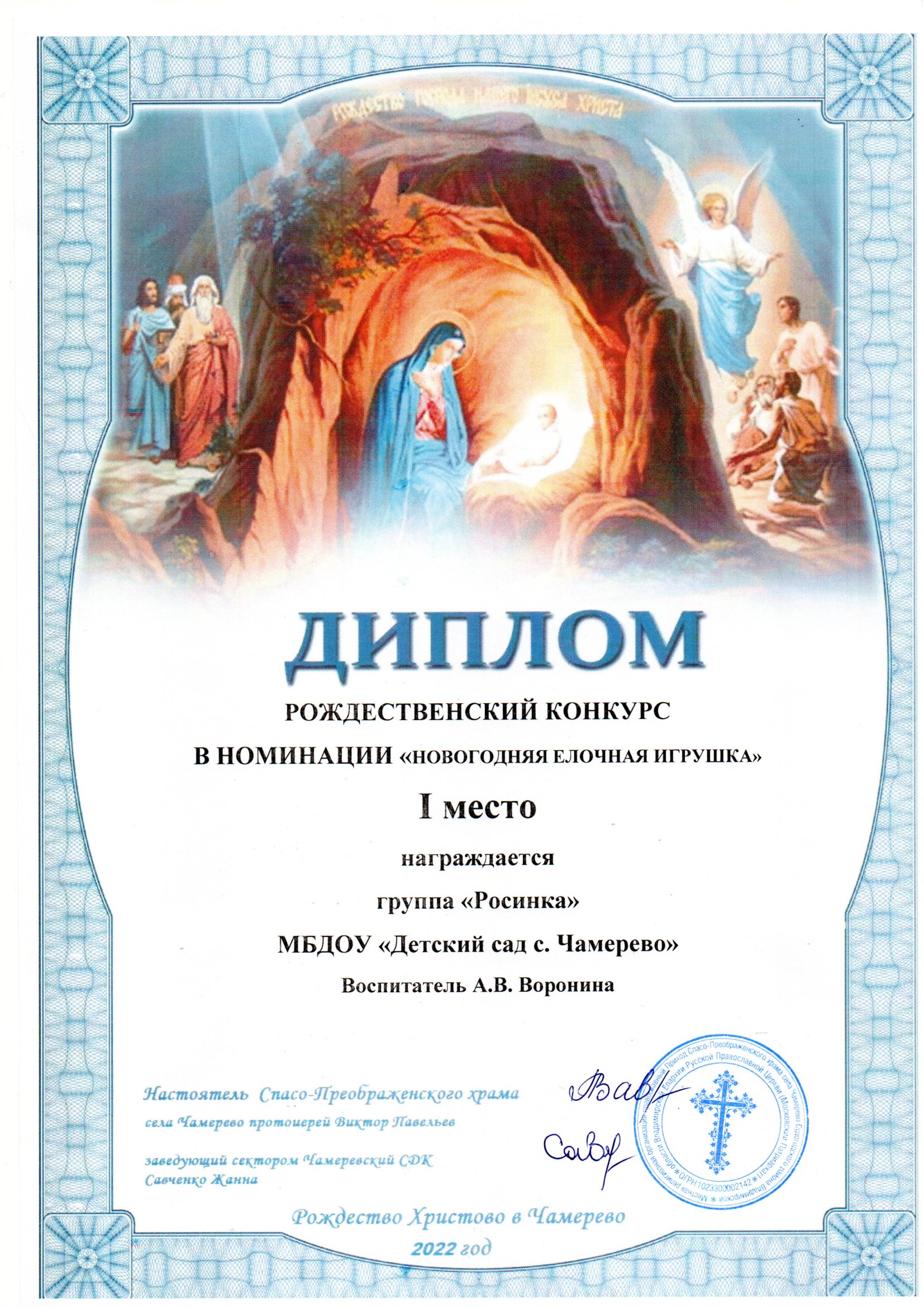 Диплом за 1-е место группе "Росинка" в Рождественском конкурсе в номинации "Новогодняя ёлочная игрушка".2022год.