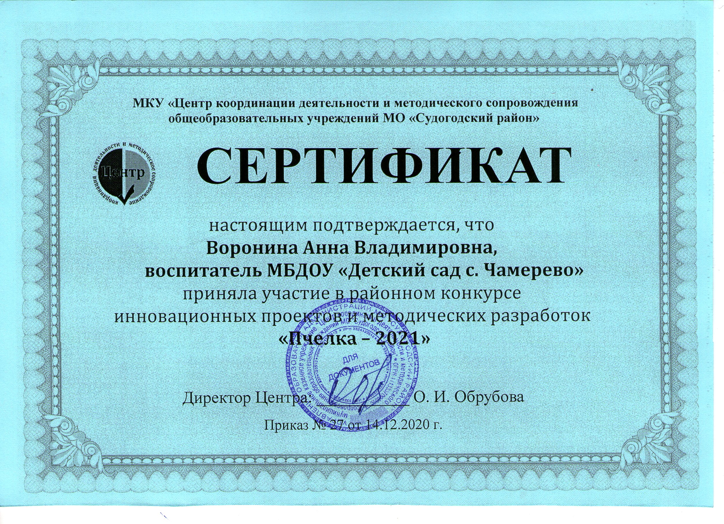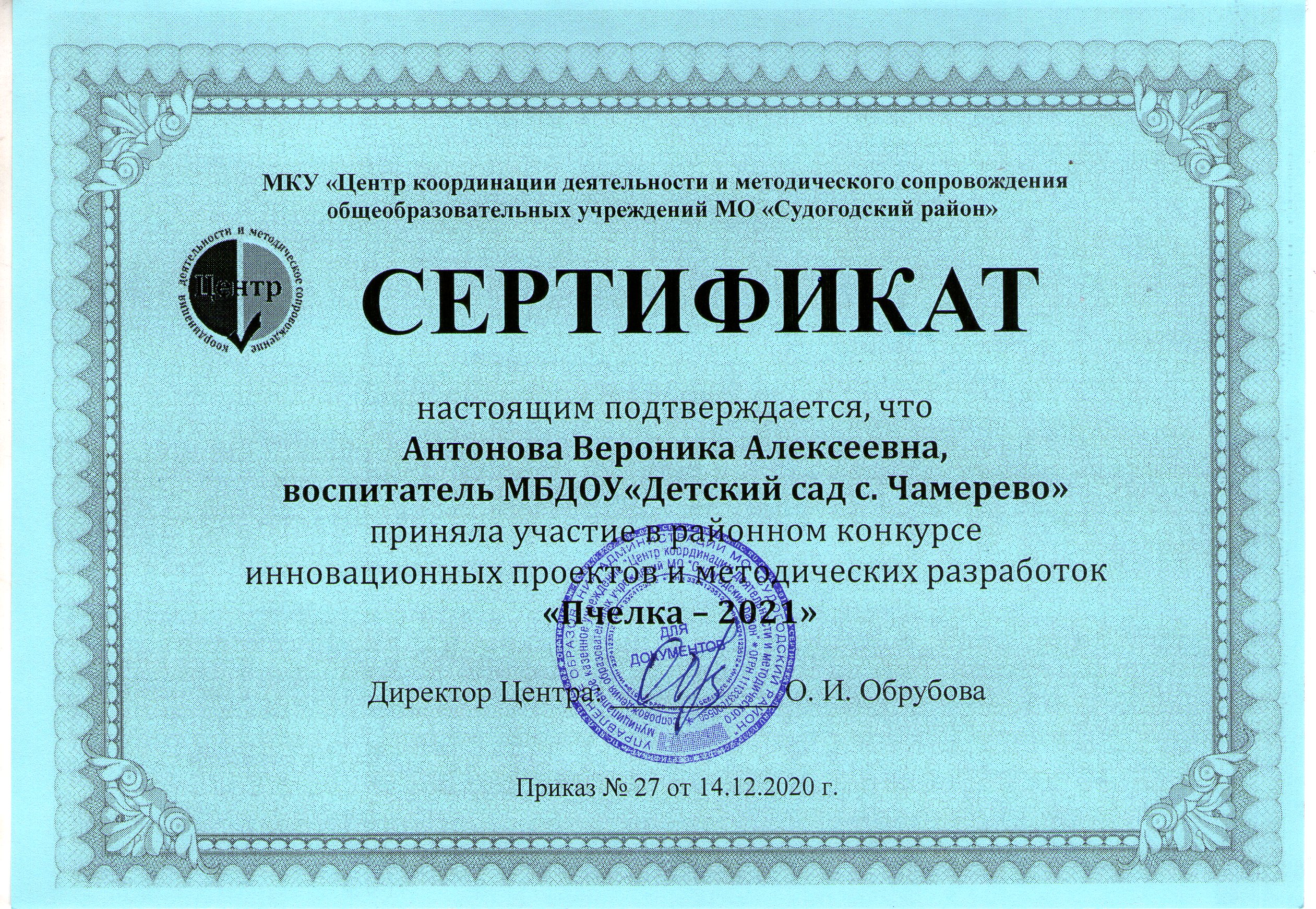 Сертификаты на участие в районном конкурсе инновационных проектов и методических разработок "Пчелка - 2020" Воронина А.В. и Антонова В.А.
