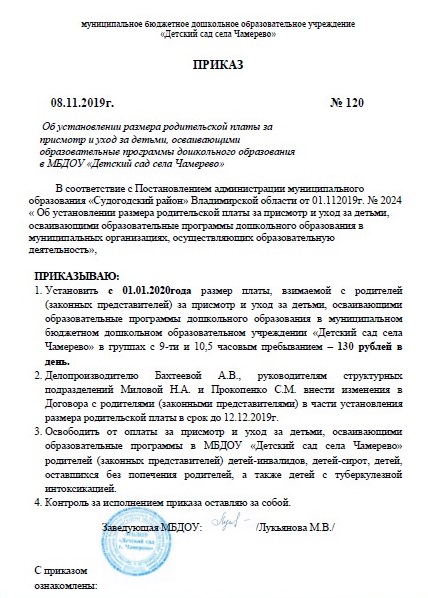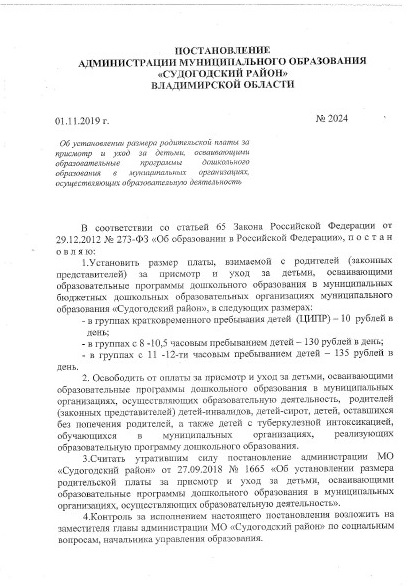 В соответствии с Постановлением администрации муниципального образования «Судогодский район» Владимирской области № 2024 от 01.11.2019 г. "Об установлении размера родительской платы за присмотр и уход за детьми, осваивающими образовательные программы дошкольного образования в муниципальных организациях, осуществляющих образовательную деятельность" изложить пункт 3.4 следующими словами:Установить размер платы, взимаемой с родителей (законных представителей) за присмотр и уход за детьми, осваивающими образовательные программы дошкольного образования в муниципальных бюджетных дошкольных образовательных организациях муниципального образования «Судогодский район», в следующих размерах: в группах с 8-10,5 часовым пребыванием детей – 130 рублей в день с 01.01.2020 г.