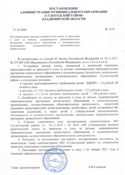 В соответствии с Постановлением администрации муниципального образования «Судогодский район» Владимирской области № 1676 от 27.10.2019 г. "Об установлении размера родительской платы за присмотр и уход за детьми, осваивающими образовательные программы дошкольного образования в муниципальных организациях, осуществляющих образовательную деятельность" изложить пункт 1 следующими словами:Установить размер платы, взимаемой с родителей (законных представителей) за присмотр и уход за детьми, осваивающими образовательные программы дошкольного образования в муниципальных бюджетных дошкольных образовательных организациях муниципального образования «Судогодский район», в следующих размерах: в группах с 8-10,5 часовым пребыванием детей – 135 рублей в день с 01.01.2021 г.